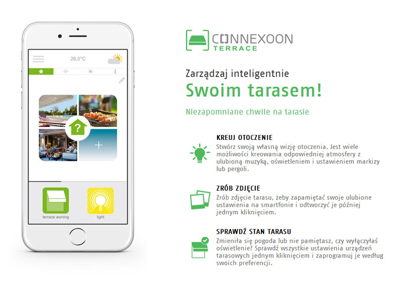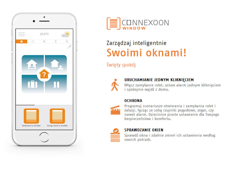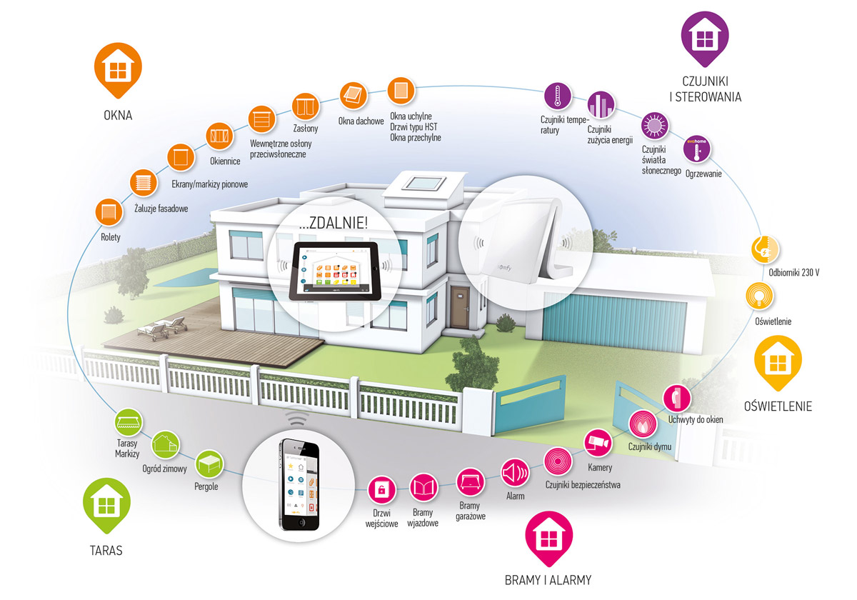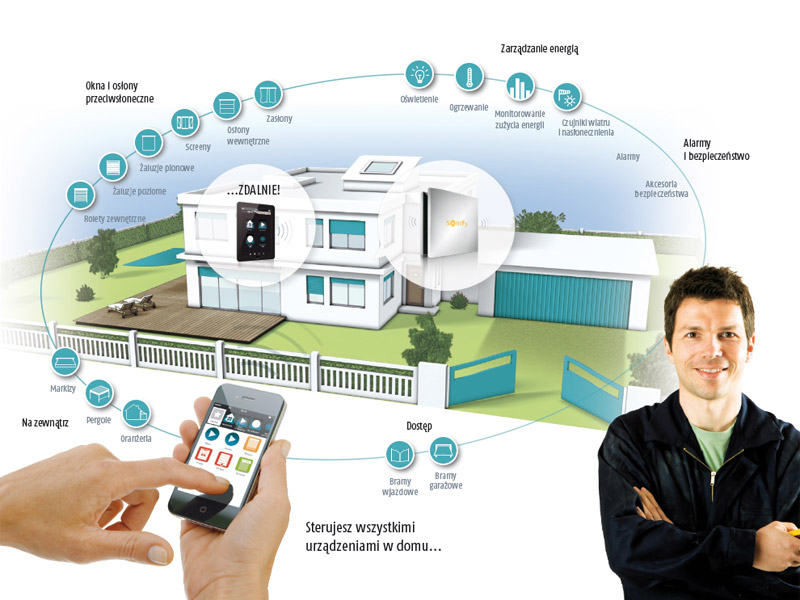 Ciesz się zaletami systemu sterowania, używając do tego wyłącznie smartwatch'a, smartfona, czy tabletu. Aplikacja Somfy pozwala zdalnie kontrolować podłączone do systemu urządzenia w Twoim domu: okna, żaluzje, zasłony, oświetlenie, bramy wjazdowe i garażowe, ogrzewanie, alarm, czy kamery.